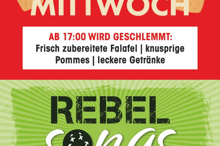 Ab 17 Uhr wird geschlemmt: frisch, knusprig, lecker. Falafel-Mittwoch zum Ankommen und Genießen.Ab 22 Uhr wird’s laut: Sneak Peak „Rebel Songs“ von den 90s bis heute, roh, wild, tanzbar.Eintritt frei…