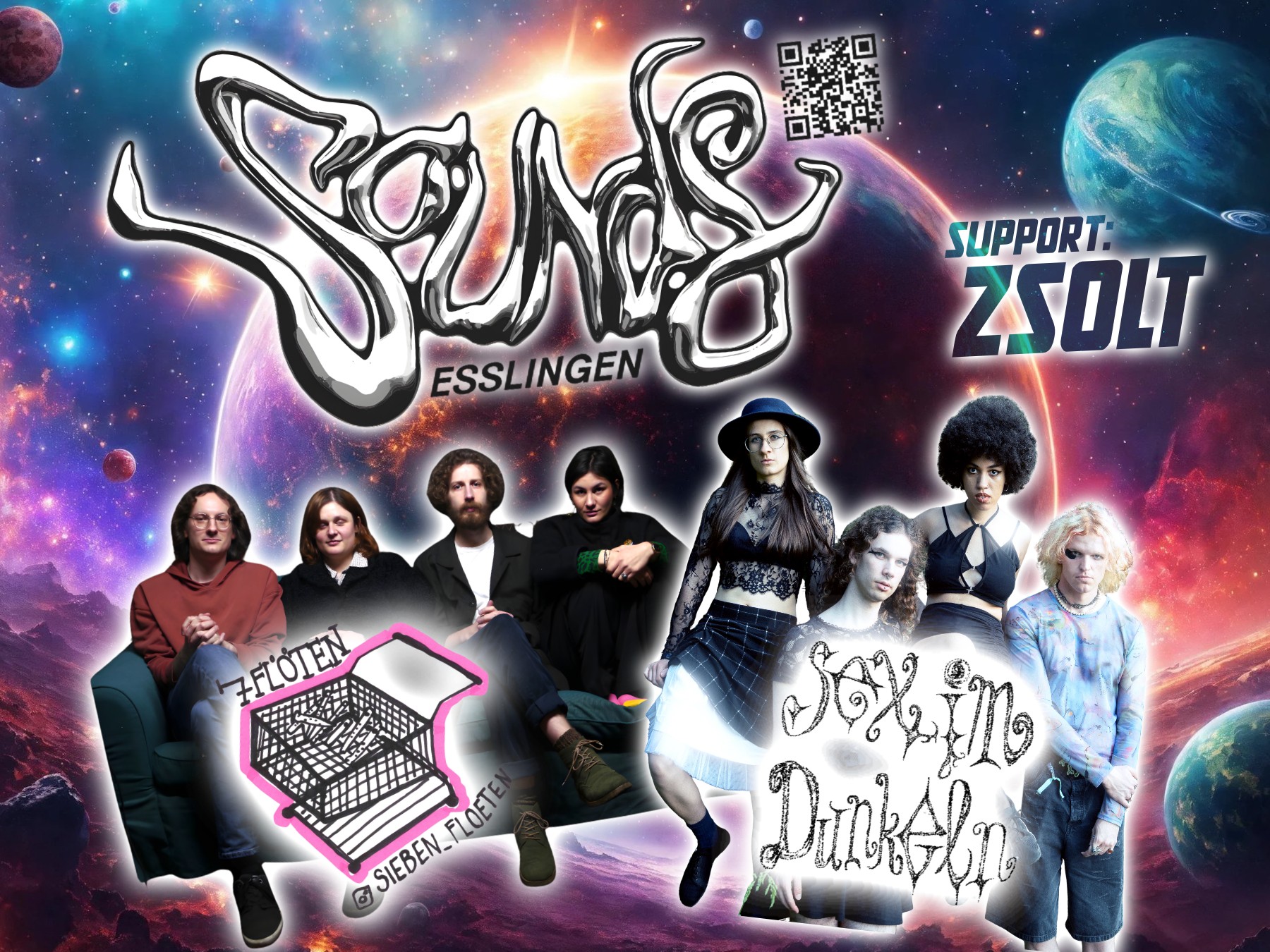 Die „7 Flöten“ spielen freshesten Indiepunk mit deutschen Texten: Tim, Alex, Anne & Jannick machen krachigen DIY-Sound mit Attitude! Rumpelnder Beat und kantige Gitarren, entschlossene Girl-Vocals und knackige Melodien.